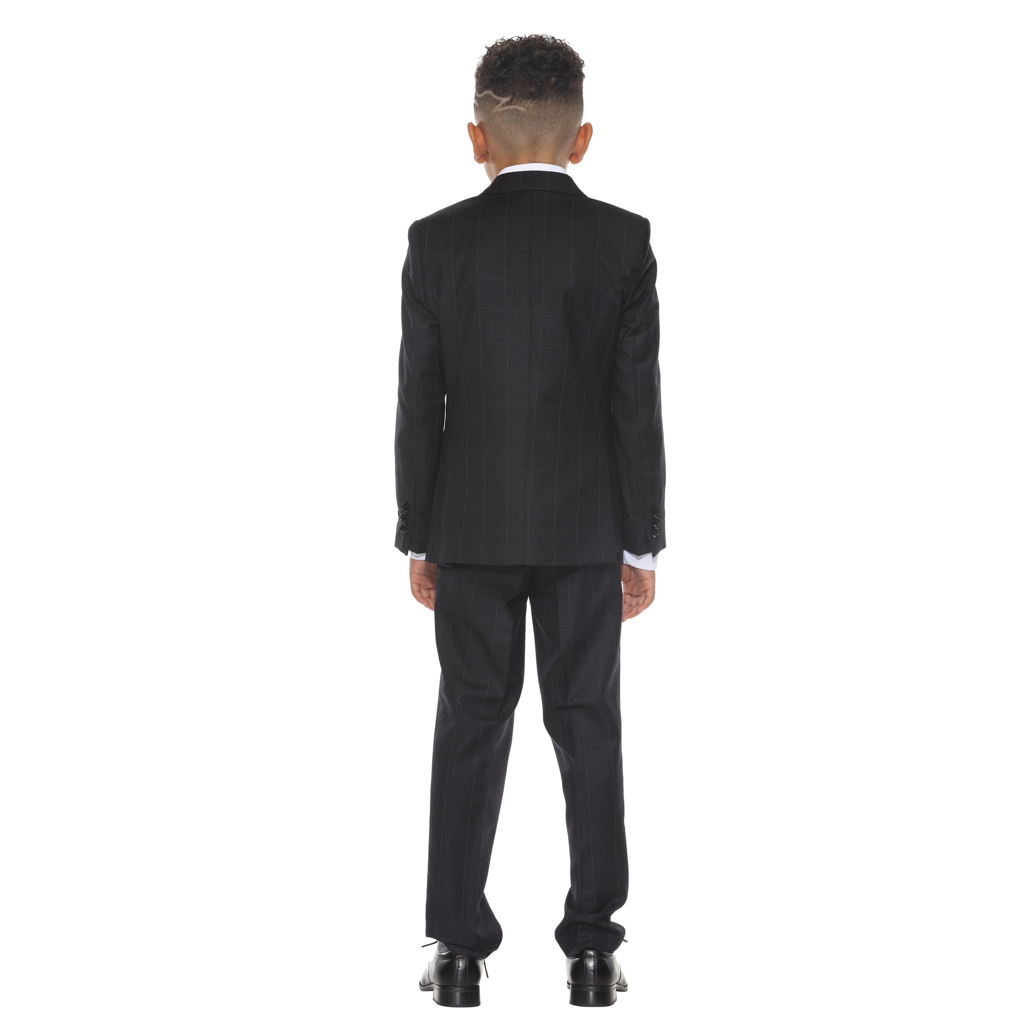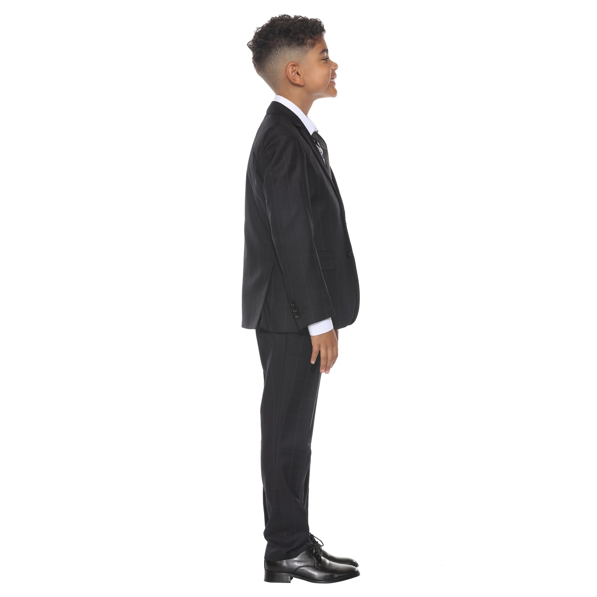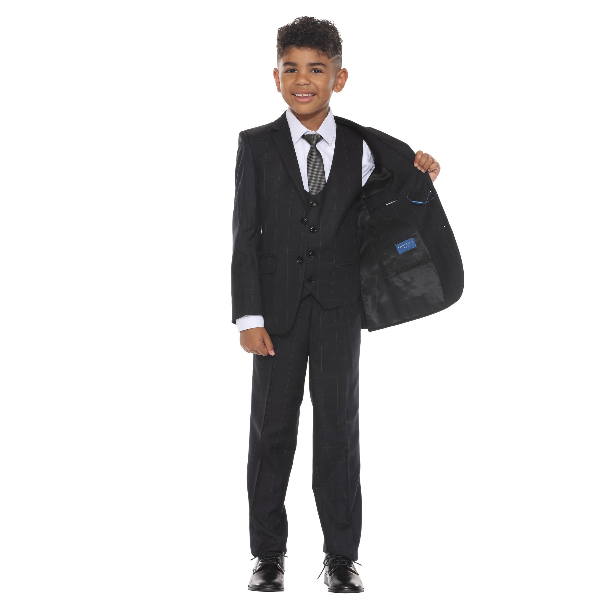 The Perry Ellis Boy's 5-Piece Windowpane Suit delivers elevated style with a bold, modern twist. This complete ensemble includes a jacket, vest, pants, tie, and dress shirt—crafted for young gentlemen who stand out. The single-breasted jacket features a clean windowpane pattern, two-button front closure, notch lapel, flap side pockets, and a traditional-length cut for a sharp, structured look. The matching vest offers a U-neckline, four-button front, and slit pockets, layering seamlessly under the jacket. Coordinating slim-fit, single-pleat pants complete the tailored silhouette. Perfect for weddings, holidays, and special occasions, this suit makes a confident statement wherever he goes.