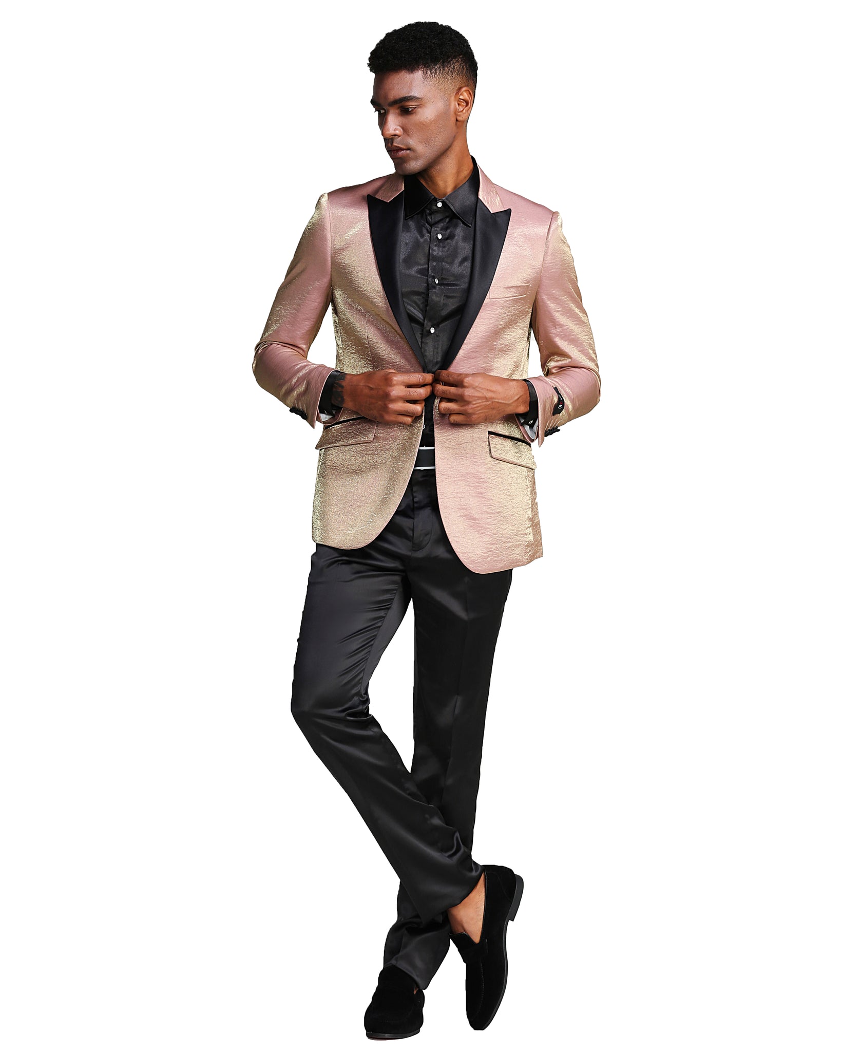 Styling: Pairs effortlessly with black tuxedo trousers (as shown) and a black shirt or a traditional white formal shirt. The look is completed here with a black bow tie and matching velvet loafers.