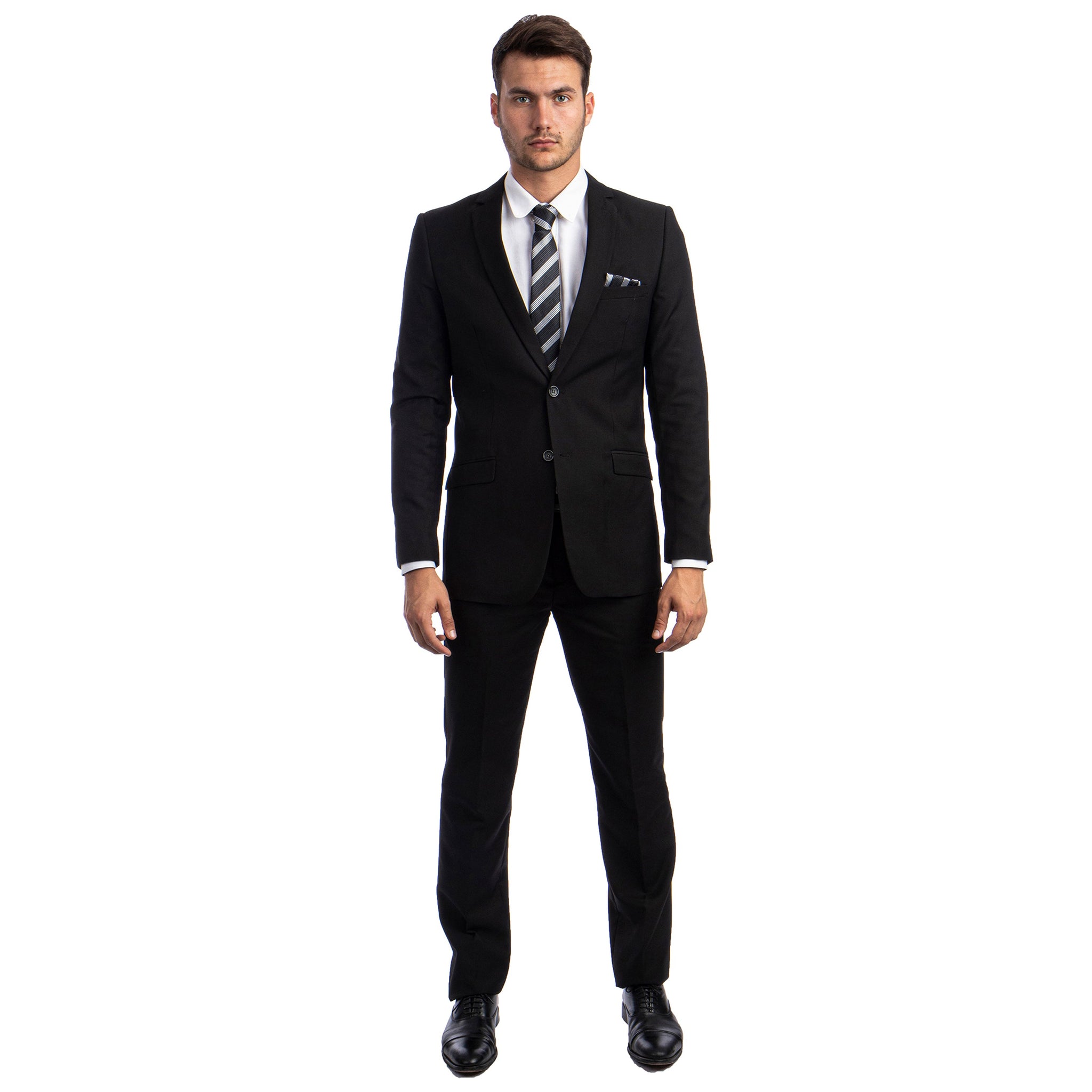 Crafted with precision, the Azzuro Men's Slim-Fit Polyester Suit 2-Piece in classic black seamlessly blends traditional elegance with contemporary sophistication. The single-breasted jacket showcases a timeless notch lapel, two-button closure, and functional side flap pockets, while the slim-fit pants offer a sleek flat front design. Constructed from premium 100% polyester fabric, this ensemble delivers impeccable style and lasting comfort. Whether for business meetings or formal events, the Azzuro suit epitomizes effortless refinement, ensuring you make a memorable impression at every occasion.