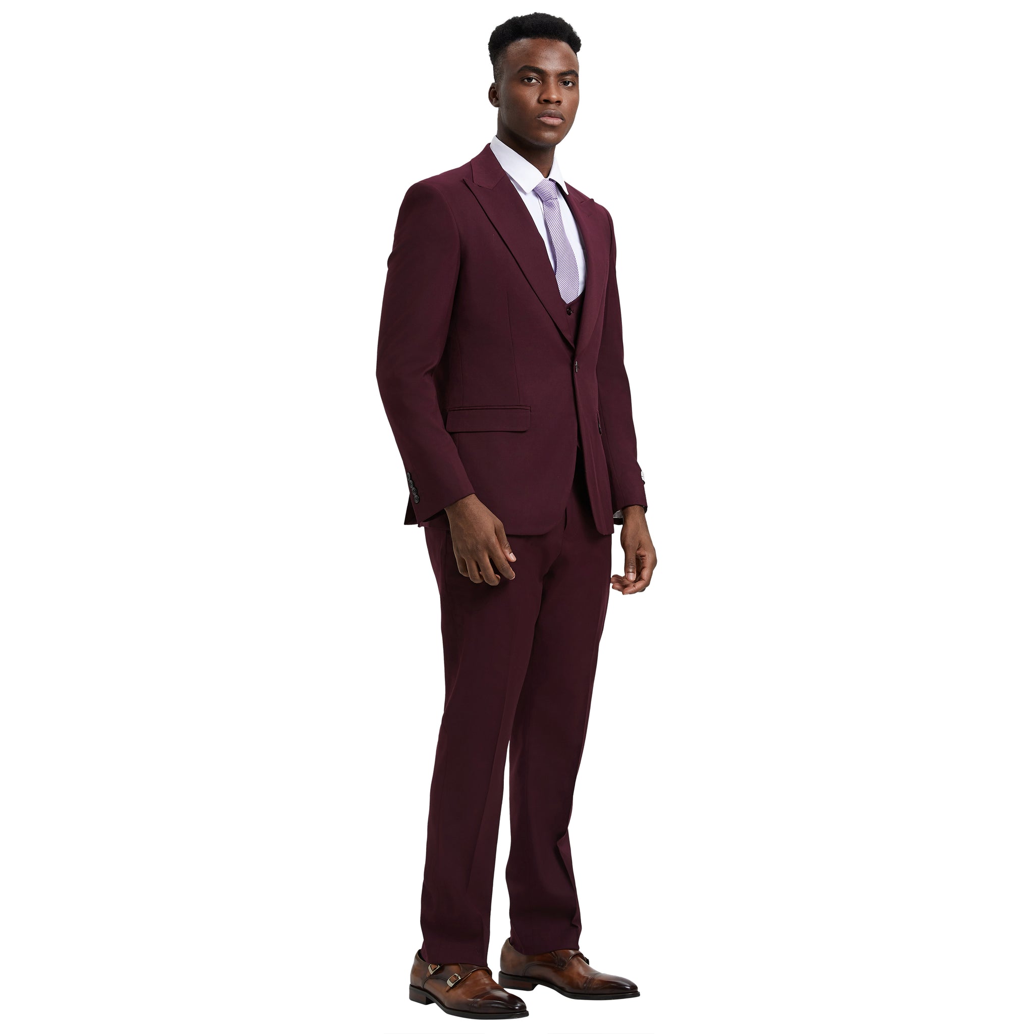 Experience timeless sophistication with the Stacy Adams Hybrid-Fit 3pc Suit Set in rich eggplant, meticulously crafted for the modern gentleman. The solid eggplant jacket boasts a two-button front closure, peak lapel, and underarm sweat guards, ensuring both style and comfort. Complementing the ensemble, the eggplant U-shaped vest features a four-button closure for added refinement. The flat-front eggplant pants, complete with an expandable waistband and functional pockets, offer unparalleled versatility. Available in slim-fit sizes 36-44 and modern-fit sizes 46-62, this eggplant suit set caters to diverse preferences, promising a tailored look for every occasion. Unleash your confidence and sophistication with the Stacy Adams Hybrid-Fit 3pc Suit Set in eggplant.